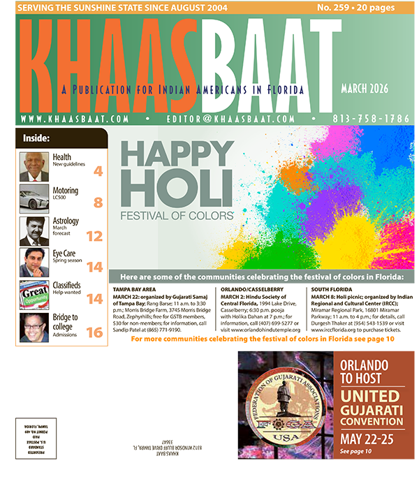 MARCH 2 and MARCH 8: on March 2, Holika puja organized by Gujarati Society of Central Florida; 6:30 p.m.; bring your own pooja thali; Shree Laxminarayan Mandir, 5020 W. South St., Orlando; free; on March 8, Dhuleti held from 10 a.m. to 4 p.m. at Olympia High School, 4301 S. Apopka Vineland Road, Orlando; free for members, $25 non-members; for information, email [email protected] or visit www.gujaratisocietycfl.com