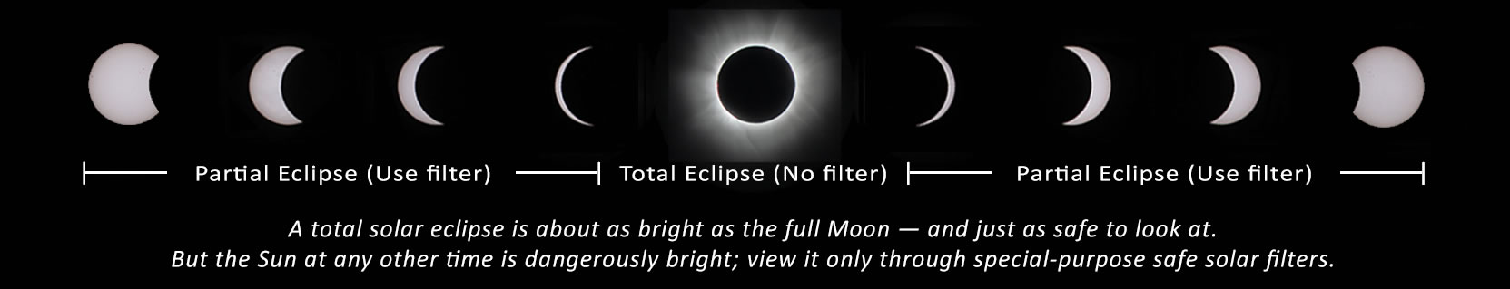 If you are within the path of totality (http://bit.ly/1xuYxSu), remove your solar filter only when the Moon completely covers the Sun’s bright face and it suddenly gets quite dark. Experience totality, then, as soon as the bright Sun begins to reappear, replace your solar viewer to glance at the remaining partial phases.