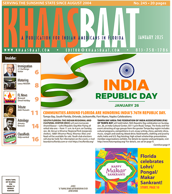 The Federation of India Associations (FIA) of Tampa Bay will hold India’s 76th Republic Day celebration on Sunday, Jan. 26, at India Cultural Center, 5511 Lynn Road, Tampa. The lively and free event attracting all age groups from the greater Tampa Bay region includes cultural programs, competitions in art, essay writing, chess, patriotic dress, music, rangoli and cooking; blood drive; food booths, clothing and jewelry stalls; India and U.S. flag hoisting; high school scholarships presentation; member organizations exhibits. For details to register and participate, visit http://www.fiatampabay.org/