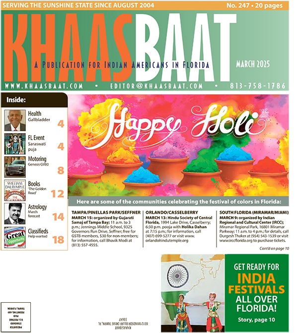 MARCH 13: Satyanarayan katha from 5:30 to 6:30 p.m., Holi Ka Dahan from 6:45 to 7:30 p.m., and mahaprasad after aarti; Ambaji Mandir, 10991 58th St., Pinellas Park; call the mandir at (727) 388-6685 or visit www.ambajimandir.com