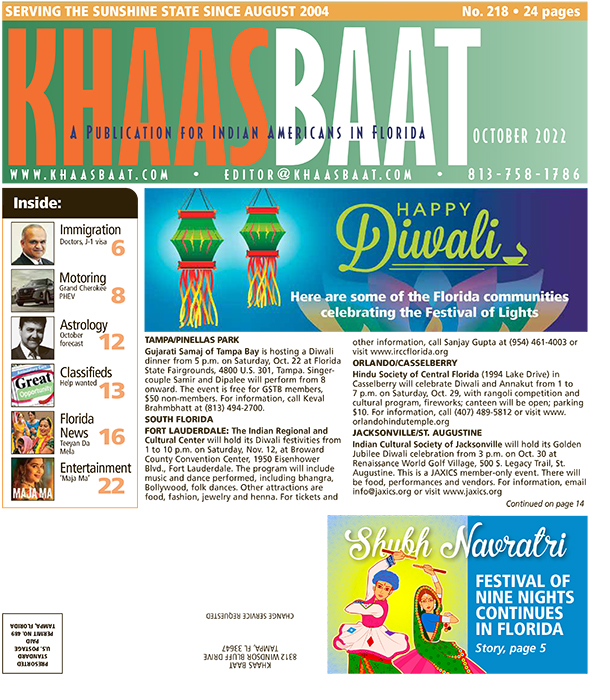 Gujarati Society of Central Florida will hold Diwali Celebration 2022 from 5 p.m. on Saturday, Oct. 29, at Rosen Center Hotel, 9840 International Drive, Orlando. Festivities include variety of foods, cash bar, Bollywood dance, kids programs. Cost: free for members, $100 non-members. For information, visit www.gujaratisocietycfl.com