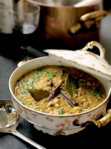 Throughout the Southern states of America, black-eyed peas are served for good luck on New Year’s Day. They’re excellent with stir-fried cabbage—also considered a good-luck food, since it supposedly represents folded currency—and rice, of course (in the South, this dish would be called Hoppin’ John). In India, my family’s recipe for rongee, Hindi for “black-eyed peas,” is just as tasty. I often make it for our grand New Year’s Eve celebration, happily knowing that the dish will probably be outshined by its fancier table competition, like crown roast of pork, Masala Chateaubriand or a biryani rice dish. We pull out the good china and the sparkling stemware, load the wine cabinet with bubbly, and trim the house with glittering baubles, like three-foot-tall glass hurricanes filled with beautiful colored glass and twinkling holiday lights strung around the mantle and into antique bird cages. Our holiday tree (purchased from Gardenworks) is lavished with ornaments collected from around the world. It is a night we all look forward to with great anticipation all year long, and any leftovers make New Year’s Day that much tastier!