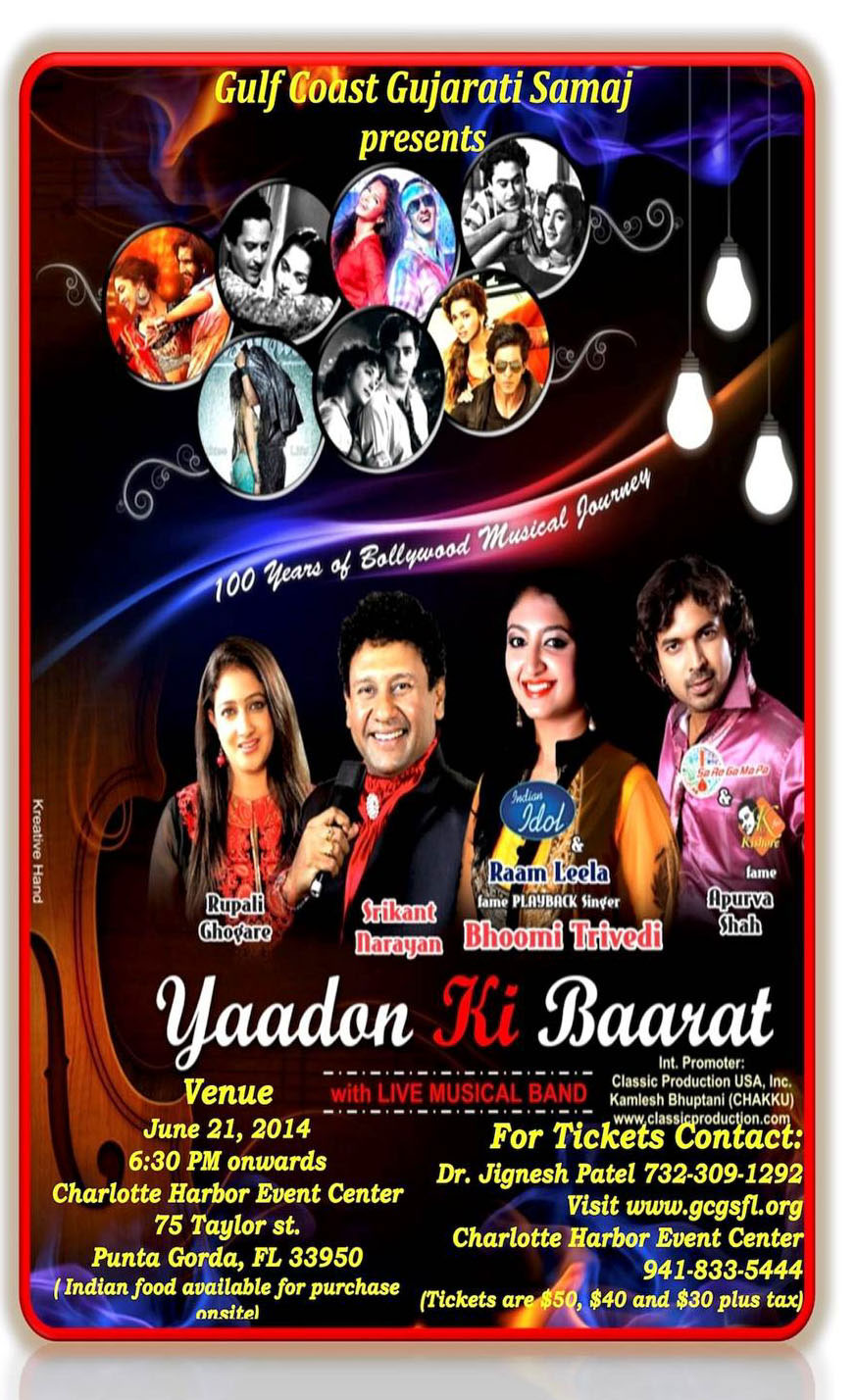 “Yaadon Ki Baarat” features singer Bhoomi Trivedi (of “Raam Leela” fame) along with Srikant Narayan (of Mohammad Rafi fame), Apurva Shah (of Kishore Kumar fame) and Rupali Ghogare. The 6:30 p.m. show will be at Charlotte Harbor Event Center, 75 Taylor St., Punta Gorda. For tickets, call Dr. Jignesh Patel at (732) 309-1292, Charlotte center at (941) 833-5444, visit www.ticketmaster.com or www.gcgsfl.org