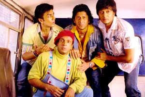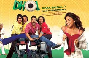 �Dhamaal�: Starring Sanjay Dutt, Arshad Warsi, Javed Jaffrey, Riteish Deshmukh, Aashish Chaudhary, Asrani, Tiku Talsania, Aftab Shivdasani, Sohail Khan; directed by Indra Kumar; music by Adnan Sami. This comic caper revolves around four friends. Riteish Deshmukh is Roy, who thinks he�s the world�s best detective. Javed Jaffrey is Manav, the biggest joker in the world and his older brother Aditya, played by Arshad Warsi, has the brains of the bunch. Completing the group is Boman, played by Aashish Chaudhary, who�s scared of everything especially his father. The four live and work together doing small con jobs. They think their lives are made when one day a dying man named Bose tells them about hidden millions. However, their misfortunes are now starting. Apparently, Police Inspector Kabir Nayak, played by Sanjay Dutt, had been chasing Bose for years. Upon finding him dead, Nayak starts questioning the suspicious group found near the body. A series of mishaps follow as all are thrust into comical but dangerous situations in the hunt for the hidden riches.
